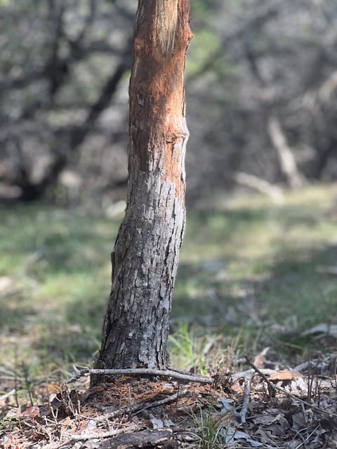 The “bokah” effect or portrait mode creates interest by highlighting an outdoor feature (like this whitetail tree rub) in the foreground and blurring the background.