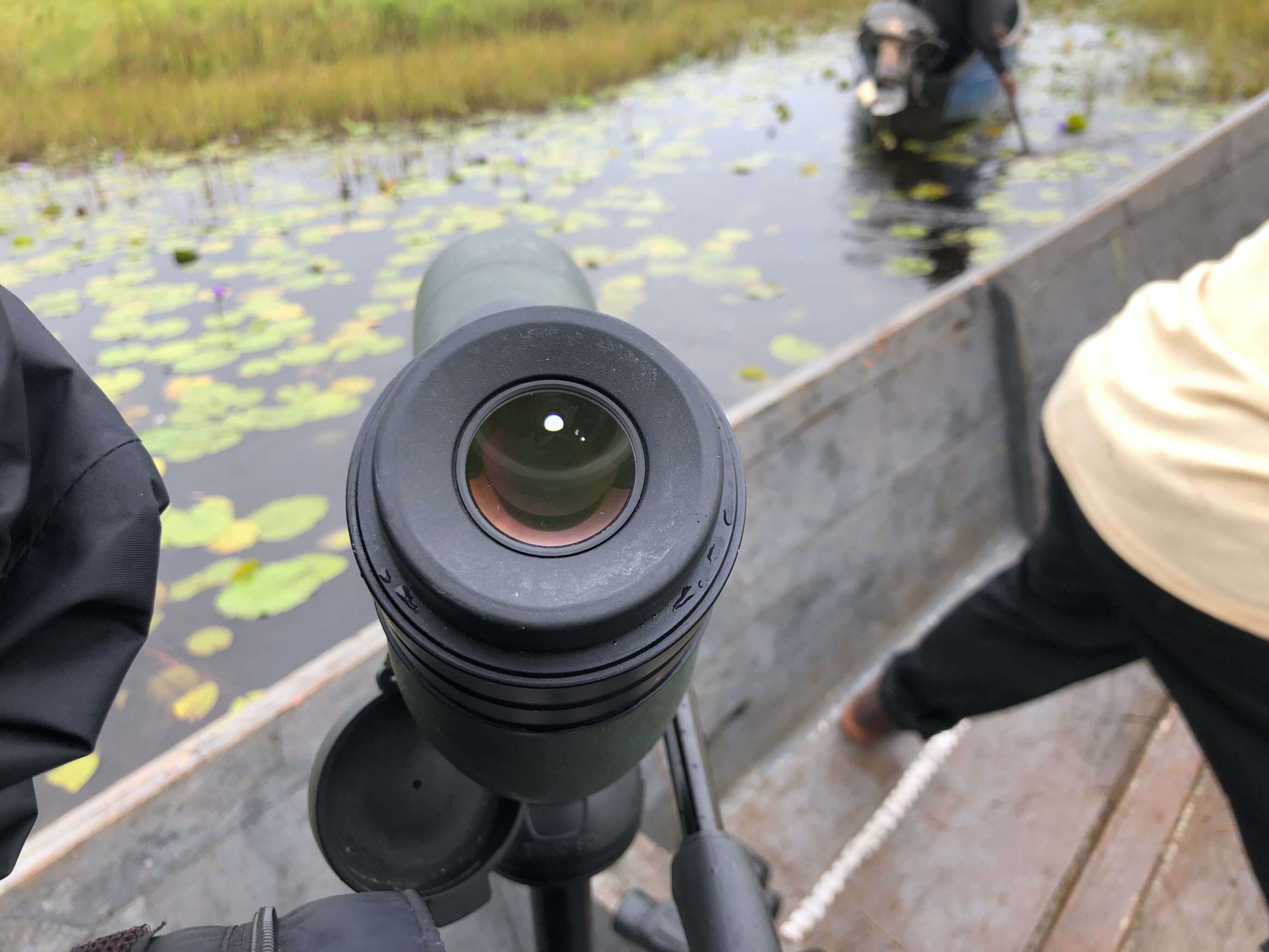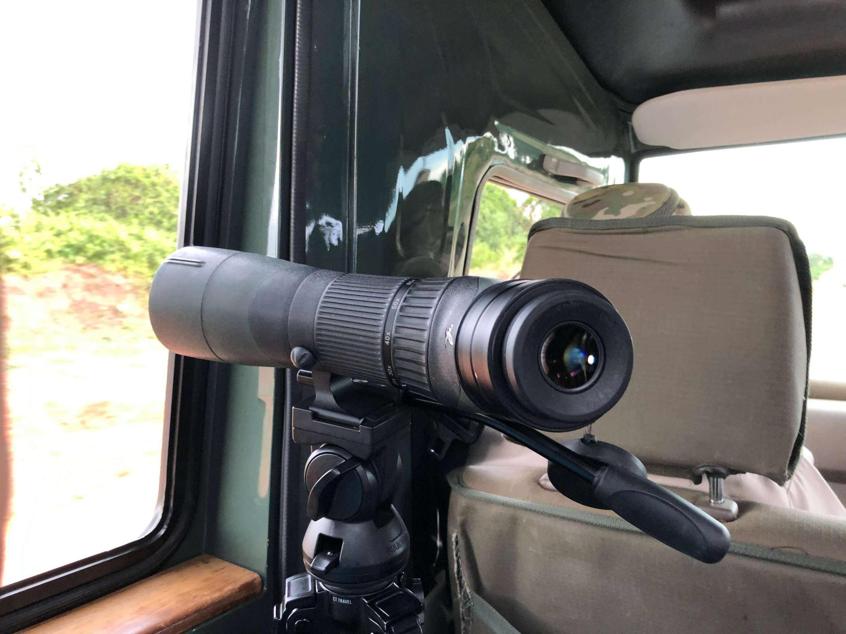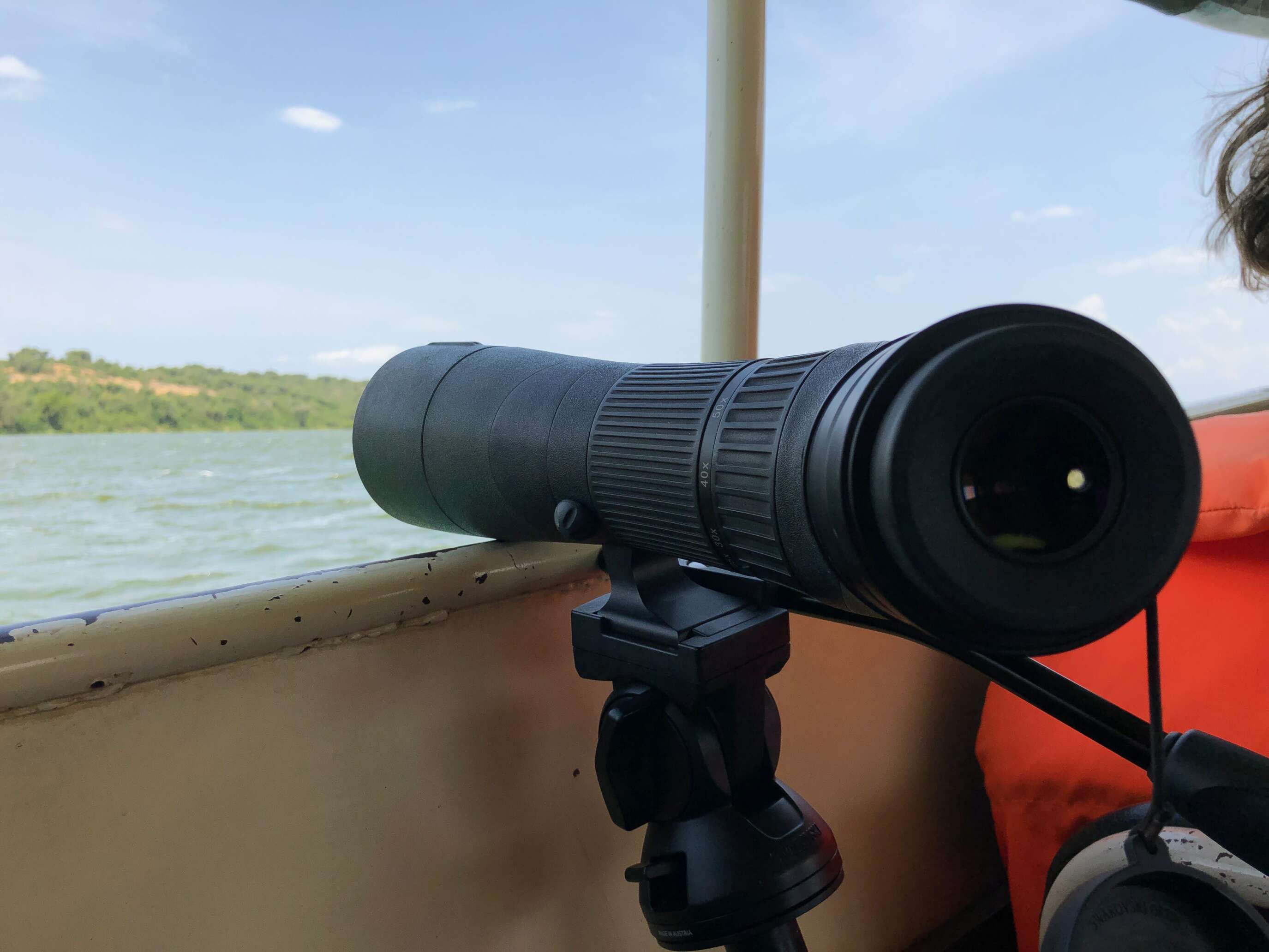 Sometimes it’s not feasible to put out your tripod legs if there isn’t enough space. Sometimes I will keep them together and then find a way to lean the scope against the window or the edge of a boat. I will sometimes lean my leg on to the tripod legs for extra stability. It may not be great for video, but for photos it works fine.