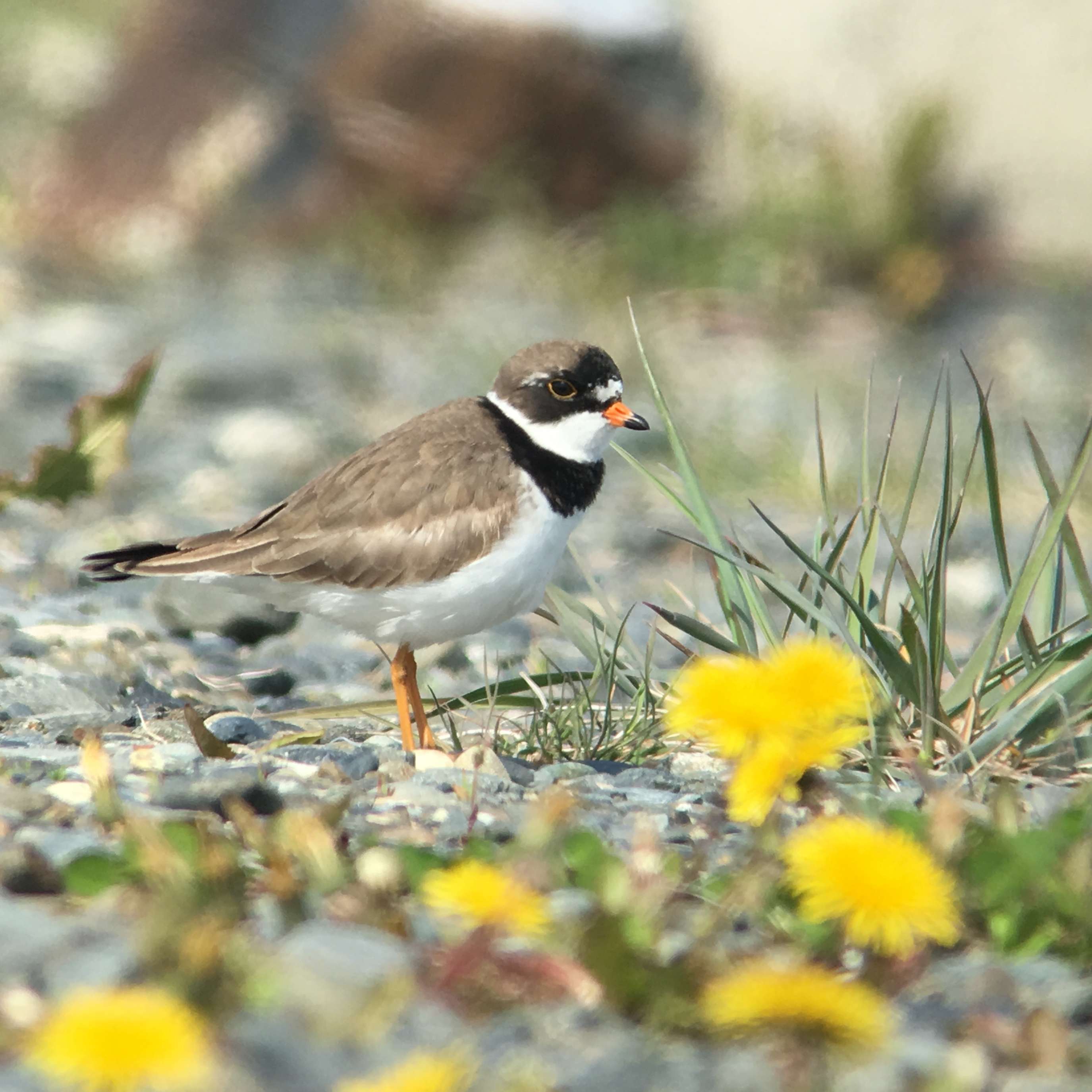 Semi-palmated Plover surrounded by dandelions in Homer, Alaska phoneskoped while sitting on the ground.