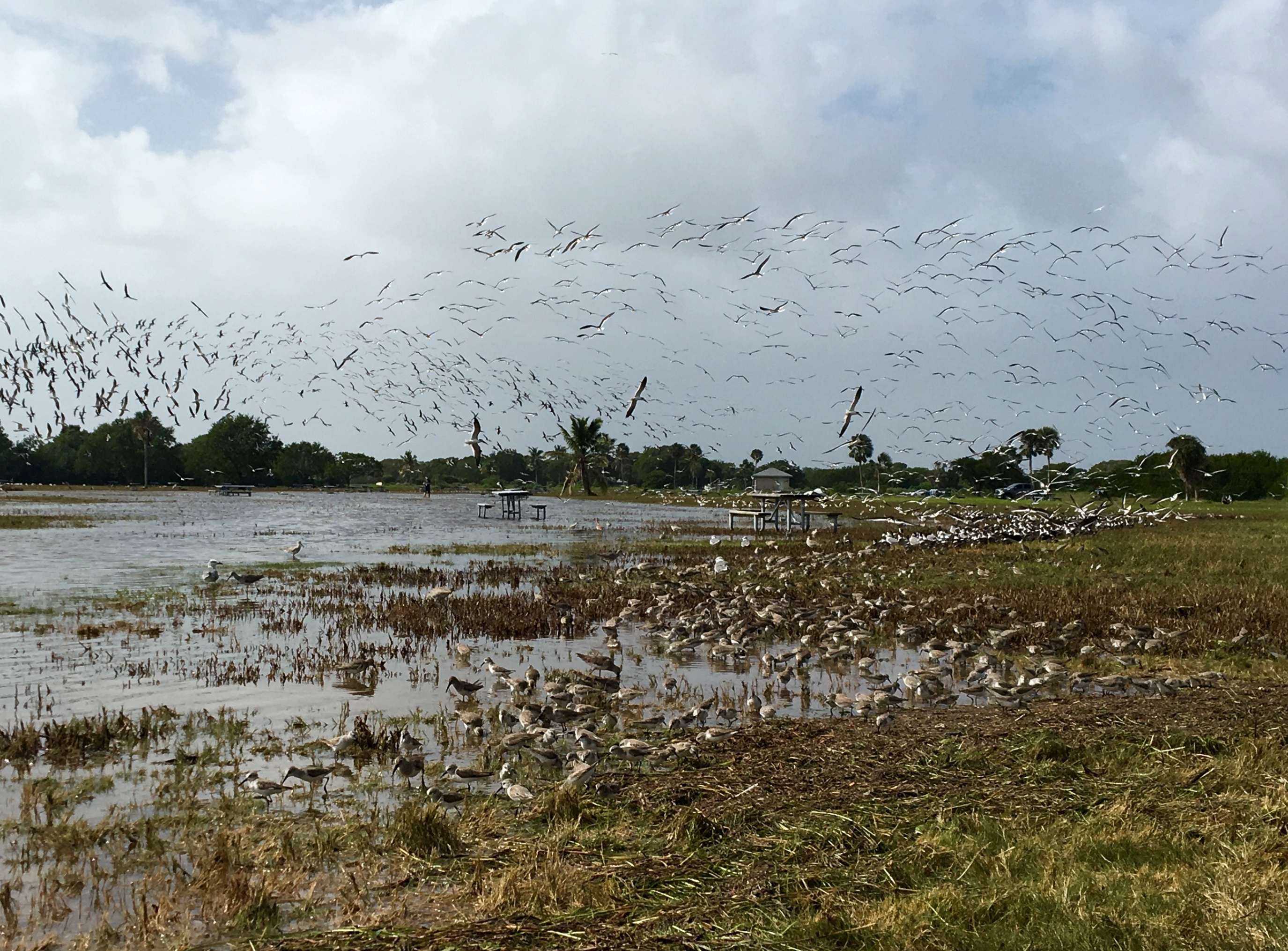 This flock of shorebirds and gulls took off when I found a seat at a nearby picnic table. But after a moment, they settled down and came within a few feet of me.