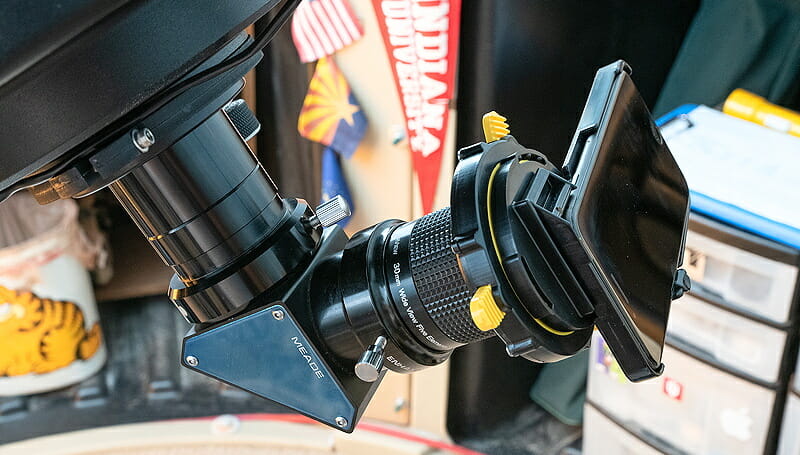 Smartphone Astrophotography has come a long way since I first began doing it 2007 with my then just released Apple iPhone. Today’s smartphones have amazing cameras and camera apps can take incredible (for a smartphone) images in low light. The simplest way to take a photograph of the Moon or bright planets using a telescope is to focus the object to your eye and then handhold the smartphone camera over the eyepiece and take a photograph. For such bright objects the shutter speed will be fast, reducing the chances of blurring the image by moving the smartphone. For fainter objects, and yes you can photograph stars, comets, nebulae, and galaxies using low-light camera apps, the smartphone should be physically attached to the eyepiece. But with most smartphone adapters that brings another challenge: getting the camera lens aligned properly over the eyepiece.
