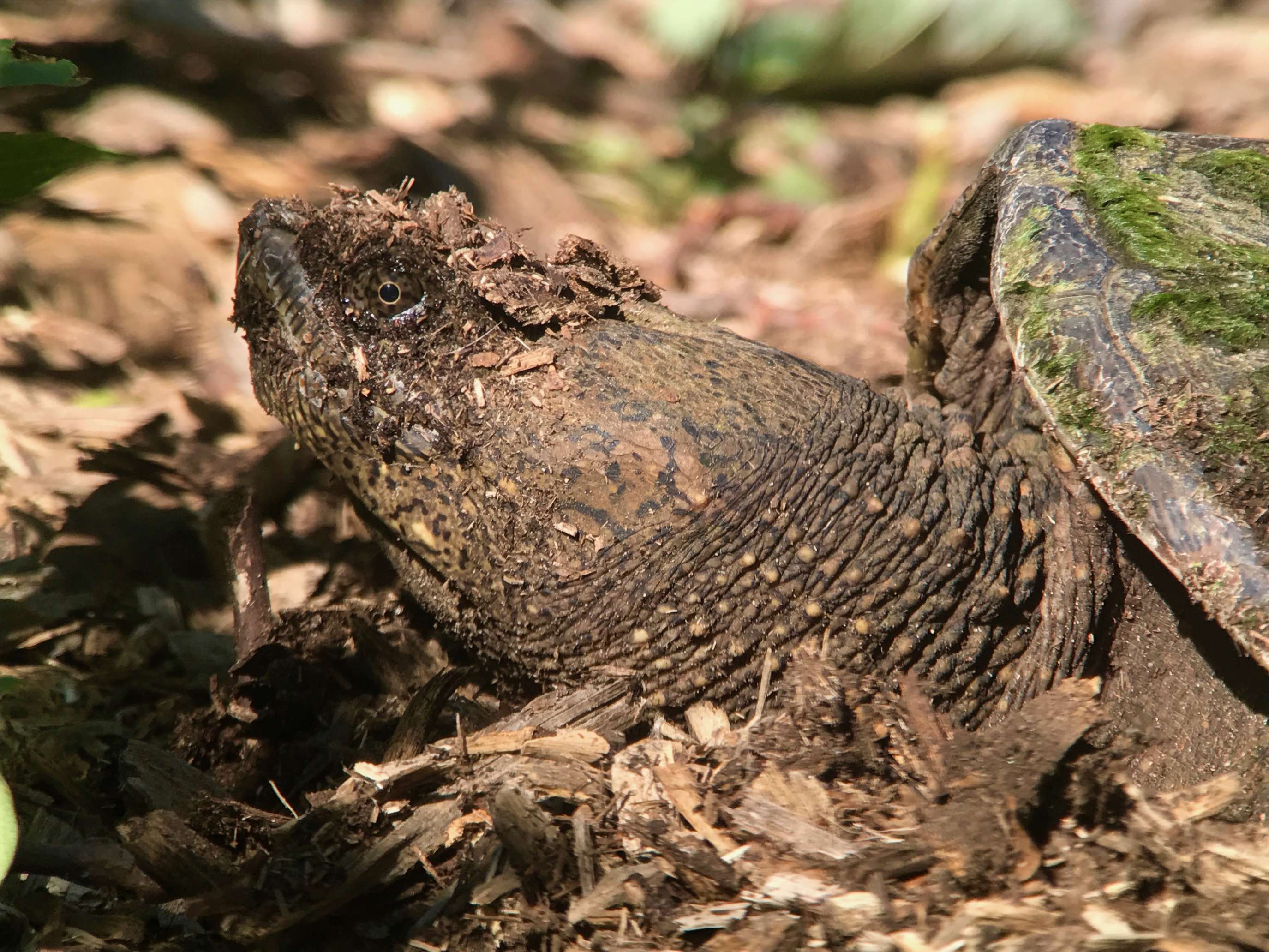 Case in point, earlier this summer I was scouting for a birding by ear class and came across a female snapping turtle laying eggs right on the trail. I generally like to give snapping turtles plenty of personal space, especially while one is moving several ping pong ball sized eggs through a small opening. However, I had my scope so I was able to capture a great shot of her face as well as even find an angle to watch eggs coming out of her and going into the nest hole. Here’s a video that I got at a safe distance:
