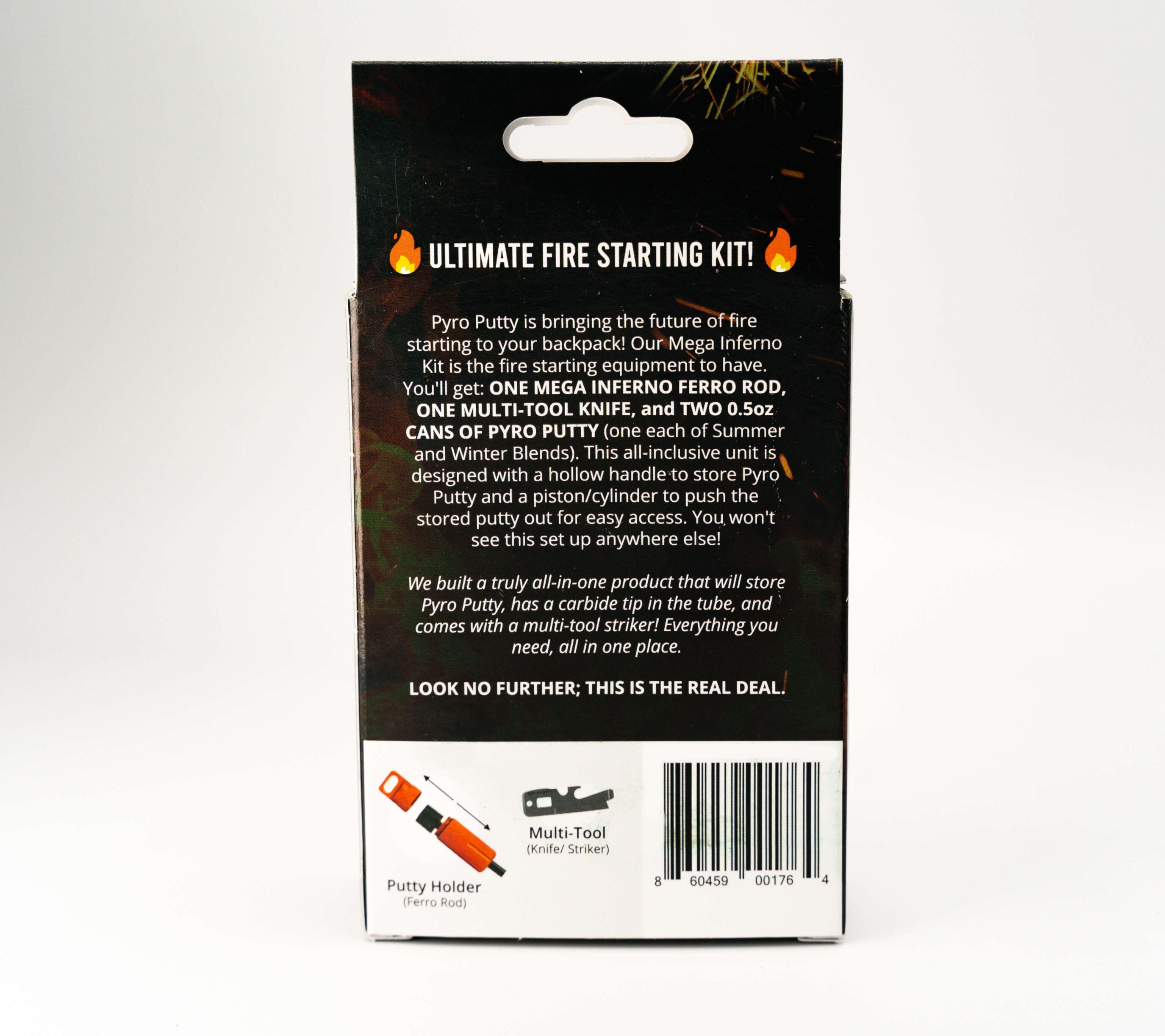 EMERGENCY FIRESTARTER KIT: Starting a fire is challenging in the wind, rain, and poor weather. That’s why we created an efficient, non-toxic fire-starting kit for every survivalist, adventurer, hunter, and outdoorsman. This kit has everything you need to start a fire – a Mega Inferno Ferro rod with storage space for putty, 2 0.5 oz. cans of our PYRO Putty, and a multitool knife that can be used as a striker.