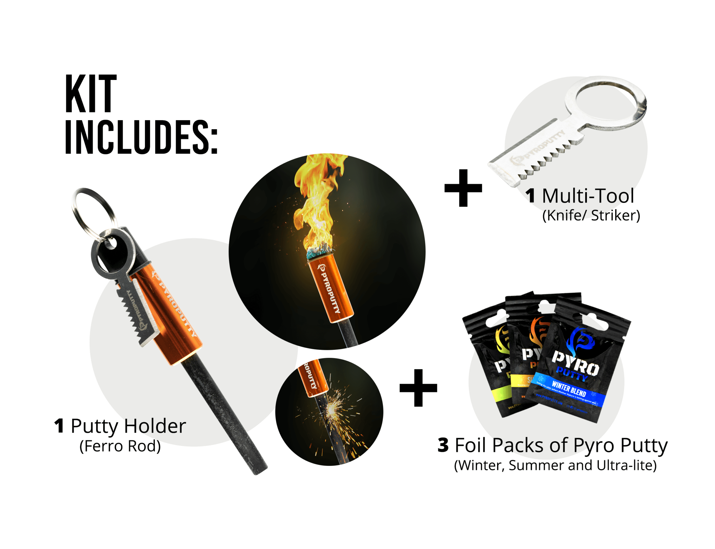 EMERGENCY FIRESTARTER KIT: Starting a fire is challenging in the wind, rain, and poor weather. That is why we created an efficient, non-toxic fire-starting kit for every survivalist, adventurer, hunter, and outdoorsman. This kit has everything you need to start a fire – a MINI Mega Inferno Ferro rod with storage space for putty, 3 Single Use Packs of our PYRO Putty, and a multitool knife that can be used as a striker.