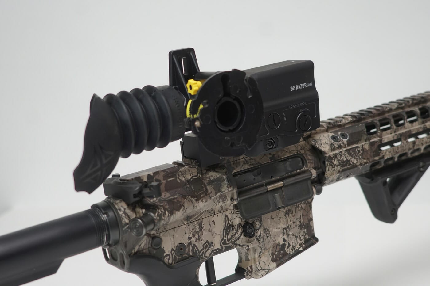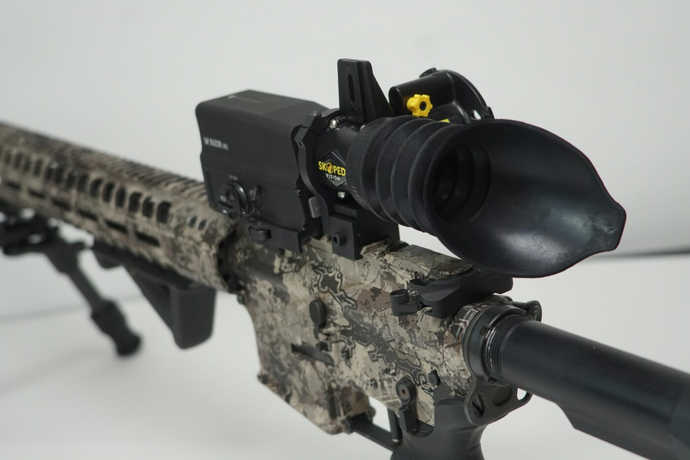 Skoped Vision has been tested for use with .223/.556 NATO Ammunition and has performed really well. We are not liable for any injury or damage to you or your equipment and/or electronics. Use Skoped Vision at your own risk.