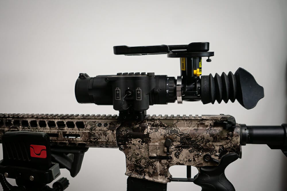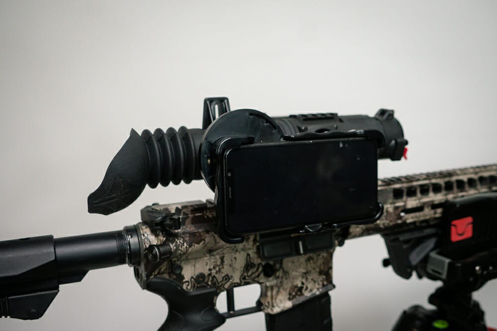 The smartphone will be mounted on the side of the rifle scope or top, giving you an unobstructed view through the scope while shooting. There is very little, if any, light or optic quality loss with Skoped Vision as the glass inside the adapter is manufactured with the utmost quality. With the universal mounting system, Skoped Vision will attach and detach in seconds to PVS 14 scopes.
